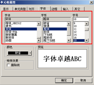 选取A1:F1区域,点击“格式/单元格”或单击鼠标右键,选择“单元格”栏目,系统弹出“单元格属性”窗口,选择“字体”页签,对表头文字的字体进行设置,设置完成后点“确定”按钮,退出单元格属性设置页面。字体属性页面如下图所示: