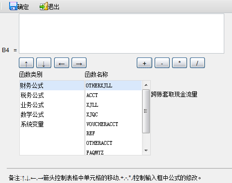 - 除了手工录入公式外,可以使用公式向导来录入公式。使用公式向导时,系统提供5中函数公式,即函数类别分别为“财务公式”、“税务公式”、“业务公式”、“数学公式”、“系统变量”。每个公式所代表的含义在右侧均有简单的介绍。例如:公式“OTHERXJLL”公式为“跨账套取现金流量”。具体的每个公式的含义会在下文具体介绍,本例中仅按照范例中用户的需要介绍使用到的公式的设置方法。主要是ACCT公式。