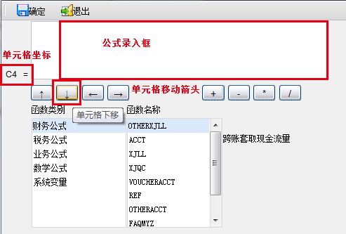- 公式录入框的下的箭头为单元格移动箭头。例如选择向下的箭头,则单元格由“B4”移动到“C4”单元格。故在公式录入页面,不需要关闭对话框,直接点击箭头来切换单元格。移动后的效果如下图所示: