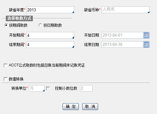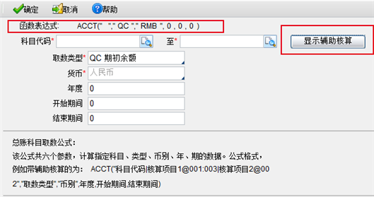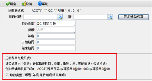 - 则“Acct("","QC","RMB",0,0,0)”,中年度、开始期、结束期间均默认为按照参数设置的数据取数,即年度为“2013”、开始期间为“4”、结束期间也为“4”。