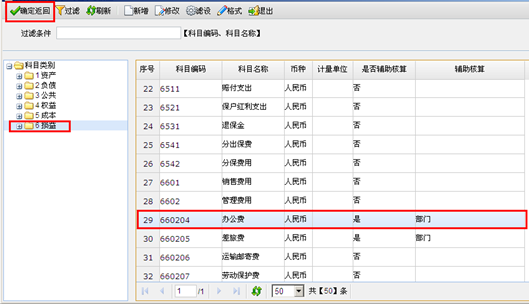(2)基础资料设置完成后,需要对科目设置辅助核算,如图,660204管理费用-办公费设置了部门的辅助核算。