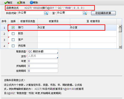 若部门辅助核算项目的范围设置为“公办室”到“财务部”,则,公式显示为“ACCT(“660204︱部门@001:002”,“QC”,“RMB”0,0,0)”,即编码为001的办公室和编码为002的财务部共同发生的管理费用-办公费(660204)。设置完成完后的公式导航页面如下图所示: