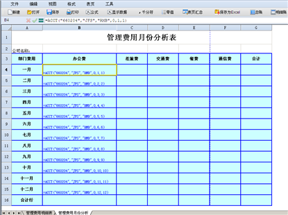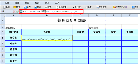 若管理费用明细项每个月份的发生额需要在一张表上体现时,可以对年度、开始期间、结束期间,进行设置。例如:在一月份的管理费用-办公费可以设置为“ACCT("660204","JFS","RMB",0,1,1)”,年度为默认的“0”,开始期间和结束期间均为“1”,这样年度会根据参数设置的变化取不同的年份,但是此单元格的月份不论参数怎么变化,都会取固定的月份。因此660204管理费用-办公费列设置完成后,公式显示如下所示: