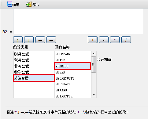 选中“B2”单元格,点击“公式”按钮或者邮件选择“录入公式”,进入公式录入导航页面,选择函数类别为“系统变量”,选择会计期间的函数“@PERIOD”,点击确定按钮,保存公式设置。设置完成后,系统会按照在“公式/公式取数参数”页面设置的会计期间显示。会计期间函数的设置如下图所示: