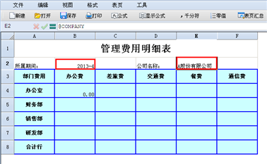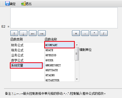 选择“E2”单元格,点击“公式”按钮或者邮件选择“录入公式”,进入公式录入导航页面,选择函数类别为“系统变量”,选择公司名称的函数“@COMPANY”,点击确定按钮,保存公式设置。设置完成后,函数会按照用户在“系统/系统信息/企业信息”中设置的公司名称进行取数。会计期间函数的设置如下图所示: