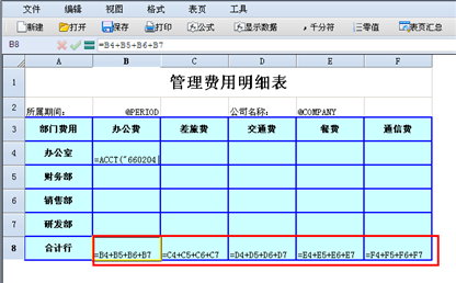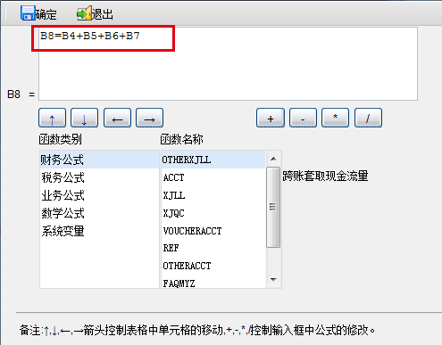 选择“B8”单元格,点击“公式”按钮或者邮件选择“录入公式”,进入公式录入导航页面,直接录入公式“B8=B4+B5+B6+B7”,点击确定保存公式。公式录入页面如下图所示: