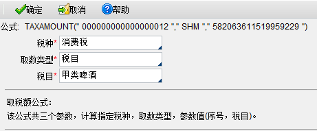 公式“TAXAMOUNT”与公式“TAXRATE”类似,公式“TAXAMOUNT”的取数来源为按照标准税额计算的部分税种,取数结果即为此类税种的标准税额。例如:消费税下甲类啤酒的标准税额为250元/吨。