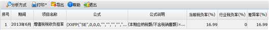 INDICATOR("增值税税收负担率")和公式TAXINDICATOR("增值税","增值税税收负担率")表示的均是取当前期间的增值税税收负担率,报表的当前期间如图所示为2013年6-6月。在该期间内,上图为纳税分析/增值税纳税分析/行业税负率对比分析页面,2013年6月,增值税税收负担率的当前税负率为16.99%。两个公式取数时以两位小数显示,故取数结果为0.17。