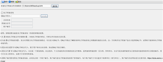 2、 勾选【电子档案系统】,表示应用配合电子档案系统模式,可以录入CA证书,CA证书保证了A6系统和电子档案系统之间数据传递的安全性。注:只有购买电子档案产品后才提供CA证书,试用时只能体验电子档案本地归档。