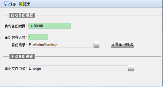 备份目录 | 通过 设置备份账套:选择自动备份的账套。 |