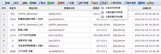 从服务器文件恢复 | 将列表中选中的账套,恢复为服务器上文件系统内存储的备份文件。 |