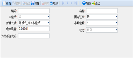 - 修改操作只能修改币种的编码、名称、固定汇率、折算公式、小数位数、最大误差信息。