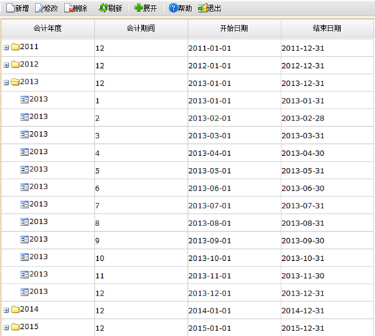 在会计期间页面选中要修改的会计期间,然后点击“修改”按钮进行修改。只能修改会计期间的开始日期,已经使用过的会计期间不可修改。