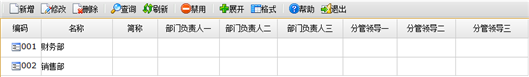 功能:部门信息维护,新增、修改、删除部门档案。部门档案信息包括编码、名称、简称等。