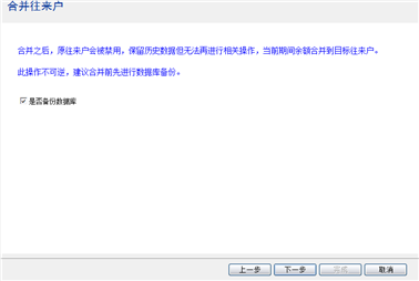 【第三步】仔细阅读页面中信息,并选择是否需要备份后,点“下一步”,如果选择“备份数据库”,则系统提示备份成功,确认后,系统弹出合并往来户页面,如下图所示。