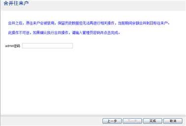 【第四步】仔细阅读页面中信息,并录入admin密码后,点“完成”按钮,则完成客户的合并。合并完成后,客户被禁用。