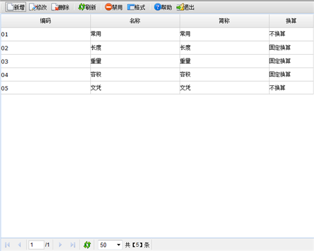 功能:用于对计量单位进行分类,满足用户多计量单位管理。可新增、修改、删除计量单位分类。