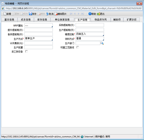 生产提前期(天) | 手工录入正整数。与MPR属性的选择有关,如果MRP选择自制,此项为必输项。 |