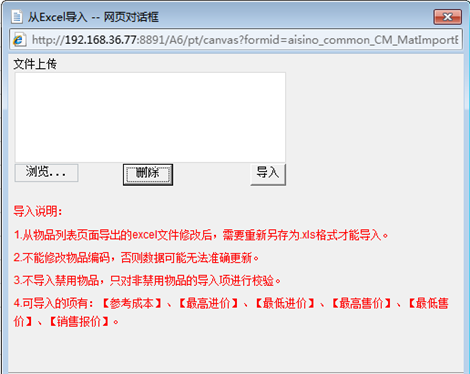【第一步】按要求在导出的excel文档上进行物品数据修改,保存后通过“浏览”按钮选中要导入的文件,如下图所示。