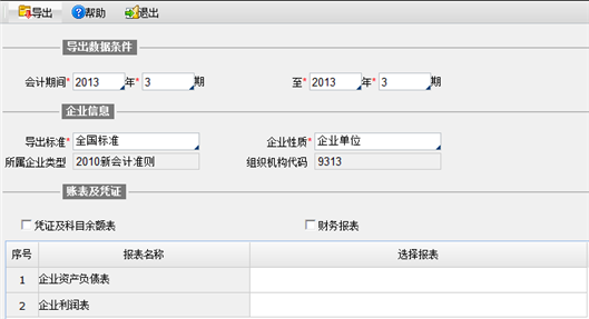 设置会计期间、导出标准、企业性质等信息后,点击“导出”按钮,将数据导出。