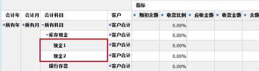 钻取替代与上面两种方式不同,以收款情况分析表为例,若库存现金下存在子级科目,在位置钻取下展开效果如下: