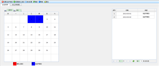 - 设置法定节假日:选中日期,点击【设置法定节假日】按钮,选中的日期被设置为法定节假日。