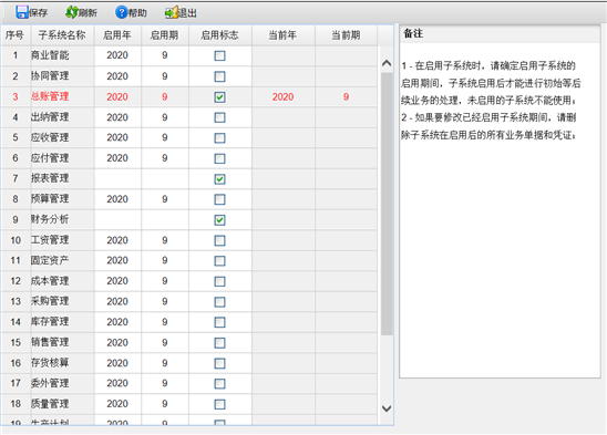 1.请根据子系统名称对照启用,未购买的子系统请不要启用,否则会影响月末结账。