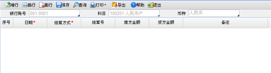 - 在银行期初页面点击〖未达账—期初企业未达账〗按钮,进入期初企业未达账项录入页面,录入相关未达账项信息。在此页面可通过〖增行〗按钮,增加一条新的未达账,通过〖删行〗按钮,将不需要的未达账项删除。