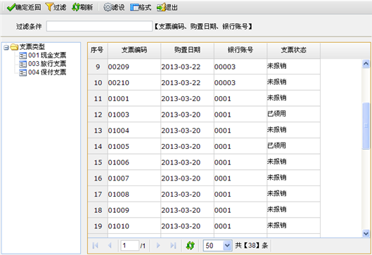 - 可在过滤条件中输入支票编码或购置日期、银行账号等信息,点击〖过滤〗按钮,方便快速定位支票。选择要领用的支票号码,点击〖确定返回〗按钮,系统返回到支票领用页面,如下图所示。
