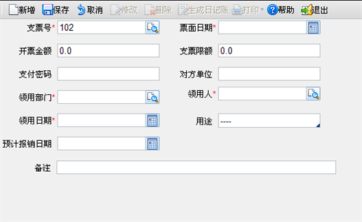 【主要功能】建立和管理支票领用档案,如领用的支票号、票面日期、领用人、领用部门等情况。