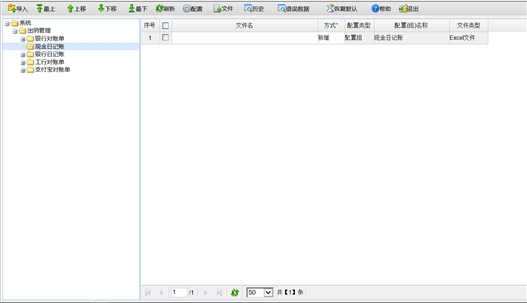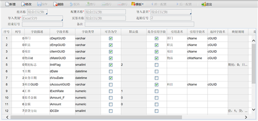 通过“生成模板”功能,系统会把当前所在的配置项生成模板。在导入配置页面,选择“现金日记账”配置项,点击〖模板〗下的“生成模板”系统只把现金日记账生成模板并下载,用户只需将要导入的单据维护到此表中,并将此表导入系统。