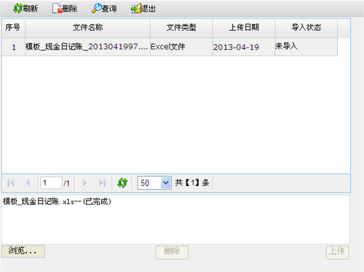 1. 在现金日记账列表页面,点击〖导入—模板导入〗按钮,进入模板导入页面。如下图所示。