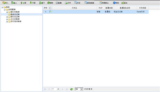 6. 在数据导入页面,选择 “现金日记账”配置组,双击文件名列下的空白行,参照选择所要导入的文件,点击〖导入〗按钮,即可执行单据的导入,并提示导入后的具体情况。如下图所示。