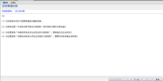 4.更新系统当前期间:系统将应收管理的期间表上一期间、当前期间加一,如果上一期为年度最后一期,则年度加一,期间为1。如果当下一期间在会计期间表中找不到时,系统会出现提示“下一期间不存在,请先维护会计期间表!”,然后结束期末结账。