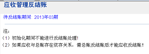 2.检查依存关系的后序子系统期间是否与应收管理当前期间相同,如果相同,则提示用户“总账系统期间已与应收管理系统期间已经同步,应收管理系统不能进行反结账!请先进行后续子系统反结账,再进行应收管理系统反结账!”如果当前期间的后序子系统未启用,不进行依存关系的判断。