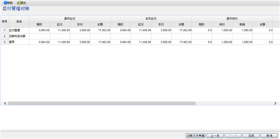 对账功能就是将应付管理系统的业务数据与总账系统的财务数据进行核对,查看两边是否一致,并且可以查找是否有业务没有记账,以保证双方数据的一致性。