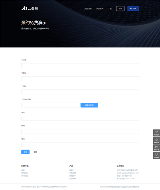 您【申请试用】或者【预约演示】时,登记下您的公司、姓名、手机号、地址、邮箱,【提交】后会反馈到A8费控运营平台,后续有专门的服务人员和您联系!