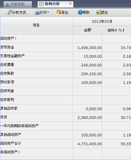 栏目说明详见3.2.3查询条件说明。设置好查询条件后点击〖确定〗按钮,对资产负债表进行分析,采用不同分析方式屏幕显示不同的页签名称,下图以结构分析方式为例: