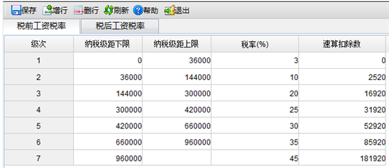 1) 在所得税率表界面,系统预置了税后工资税率、税前工资税率两项内容,点击〖增行〗按钮,可以在各税率表下增加新的级次;