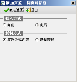 点击“表页/插入表页”菜单,或者在页签的位置单击右键,选择“插入表页”,系统弹出“添加页签”的页面。选择插入方式,点击“确定返回”则系统按照插入方式自动增加一个除了页签,和原页签内容一样的表页。但是插入的表页,页签名称不会复制到新表页,新表页的页签需要重新命名。添加页签的页面如下图所示: