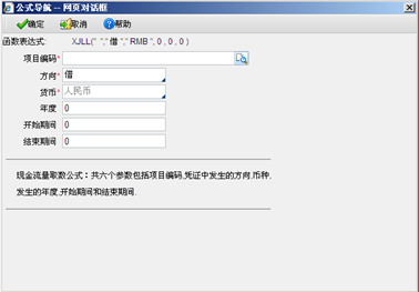 - 公式的取数来源为总账管理模块录入凭证时输入的现金流量项目。对现金类科目设置了现金流量项目的核算,在总账管理模块中录入凭证时,可以同时录入科目所对应的现金流量项目。