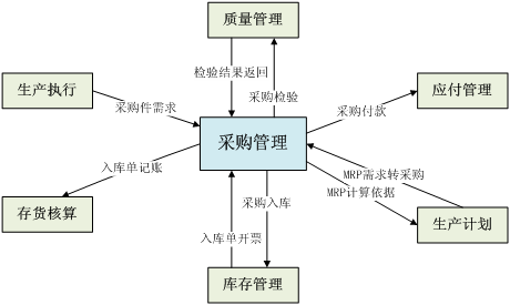 采购管理子系统可以单独应用,也可以分别与销售管理、库存管理、质量管理、生产计划、生产执行、存货核算、应付管理及总账管理子系统中的一个或几个子系统集成应用。