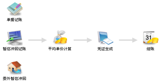 在采购、销售、库存均没有启用的情况下,系统允许存货核算系统单独使用。此时,在存货核算系统可以直接录入采购入库单、产成品入库单、其它入库单、销售出库单、材料出库单、其它出库单,并进行单据记账,成本计算。操作流程如下图所示。