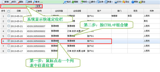 【第一步】进入销售订单列表,用鼠标点击列表中任意位置后,按CTRL+F组合键,如下图所示: