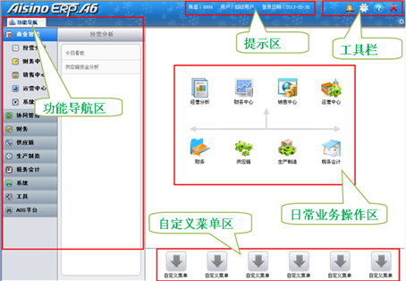 输入用户及密码后,进入企业管理软件页面。企业管理软件页面主要包括五个部分,分别为功能导航区、日常业务操作区、系统菜单、我的系统区、提示区与初始化向导。本软件分为基础版、标准版,所有版本界面操作功能基本相同,下面以标准版为例进行介绍,如下图所示。