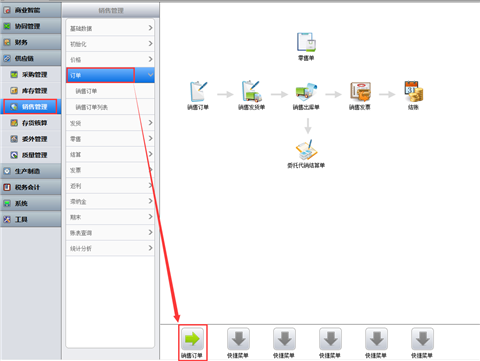 用户可以把自己工作中常用的菜单拖拽到某个自定义菜单上。比如销售订单用的比较多,那就可以把销售订单拖拽到某一个自定义菜单上后,松开鼠标即可。如下图所示。